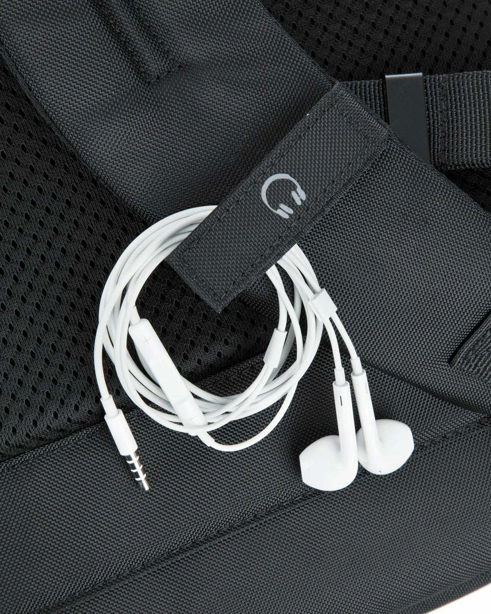 – Adjustable padded shoulder straps; Velcro headphone gate