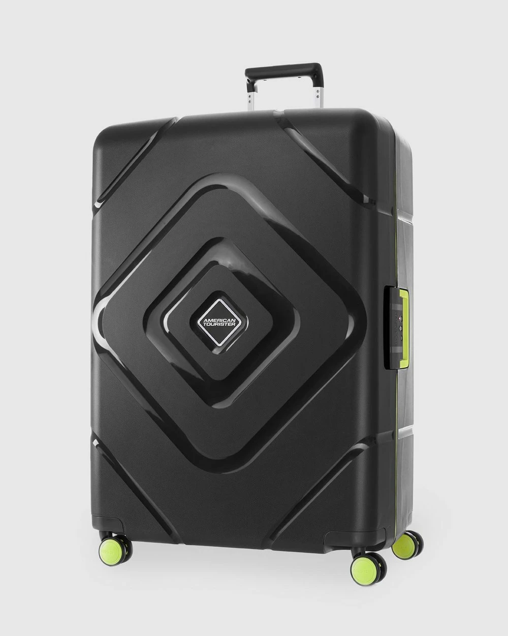 – Black hue; lime green accents
