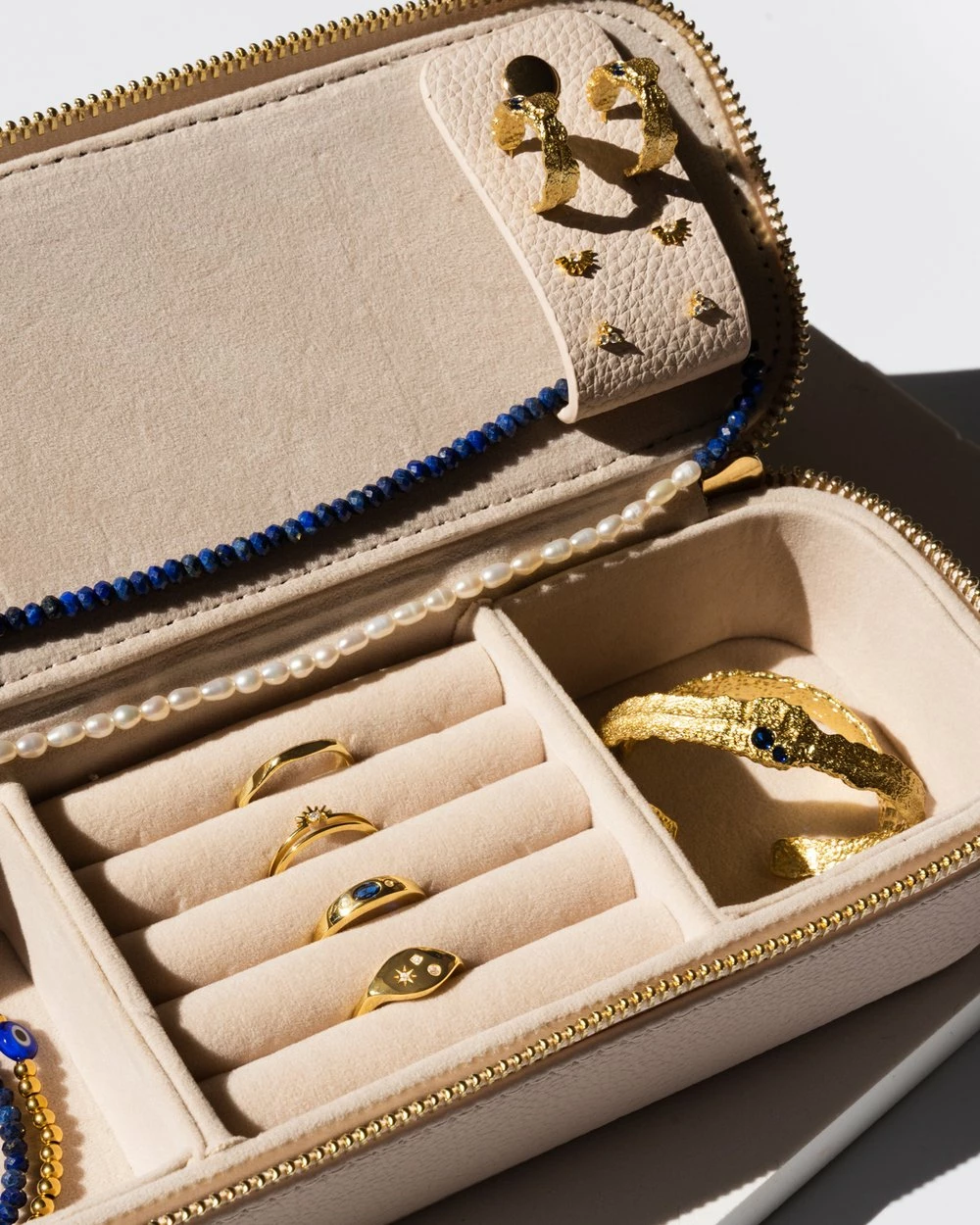 The Monroe Jewellery and Cosmetic Travel Bag exclusively from Arms Of Eve is the new innovative accessories that brings fashion, function and travel all together into one beautiful and handy bag! Designed to safely store your jewellery in the bottom, and all you cosmetic and travel needs in the top, you will soon wonder how you ever lived without this classic beauty! Arms of Eve creates timeless pieces that celebrates traditional womenβs artisanal handwork, crafting bespoke accessories for todayβs woman.