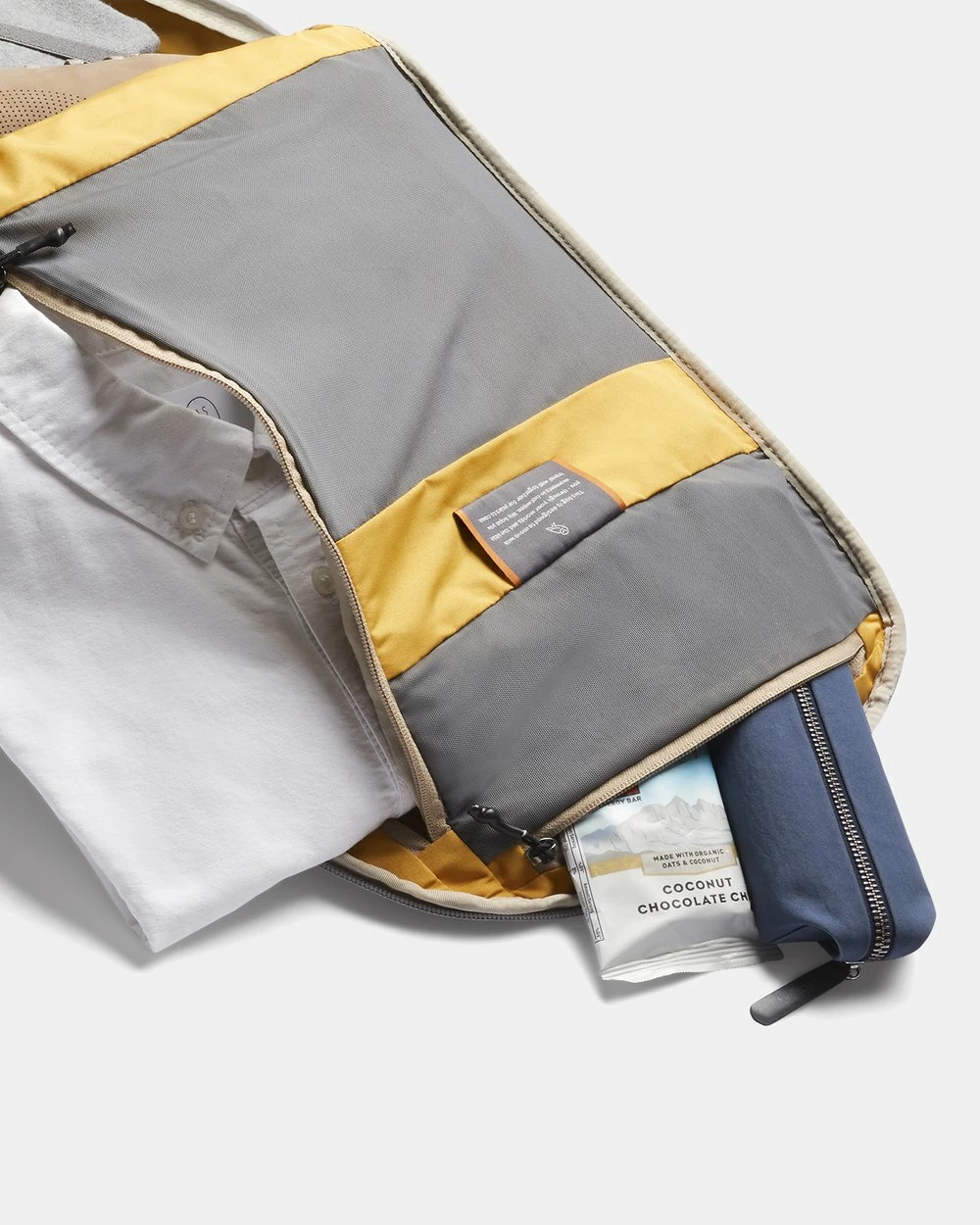 – External-access pockets invisibly store a passport, wallet, water bottle and more