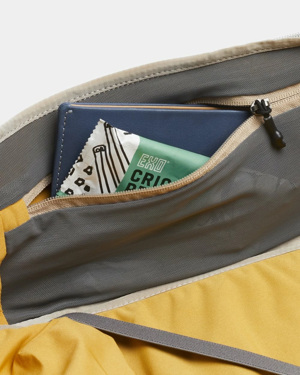 – External-access pockets invisibly store a passport, wallet, water bottle and more