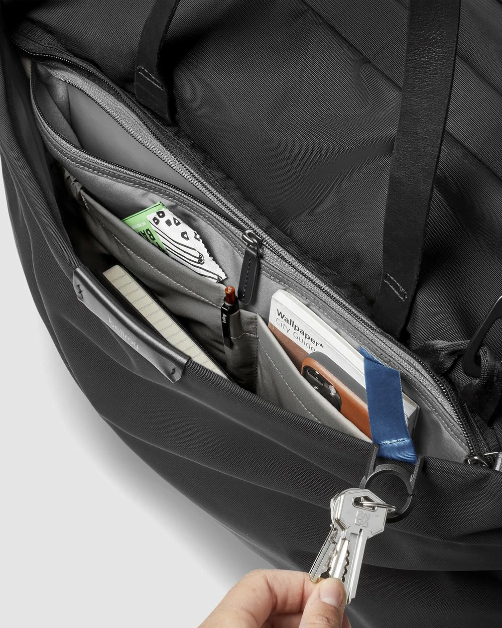 – Organizational βtool beltβ keeps internal pockets and zips at the same height, for easy access