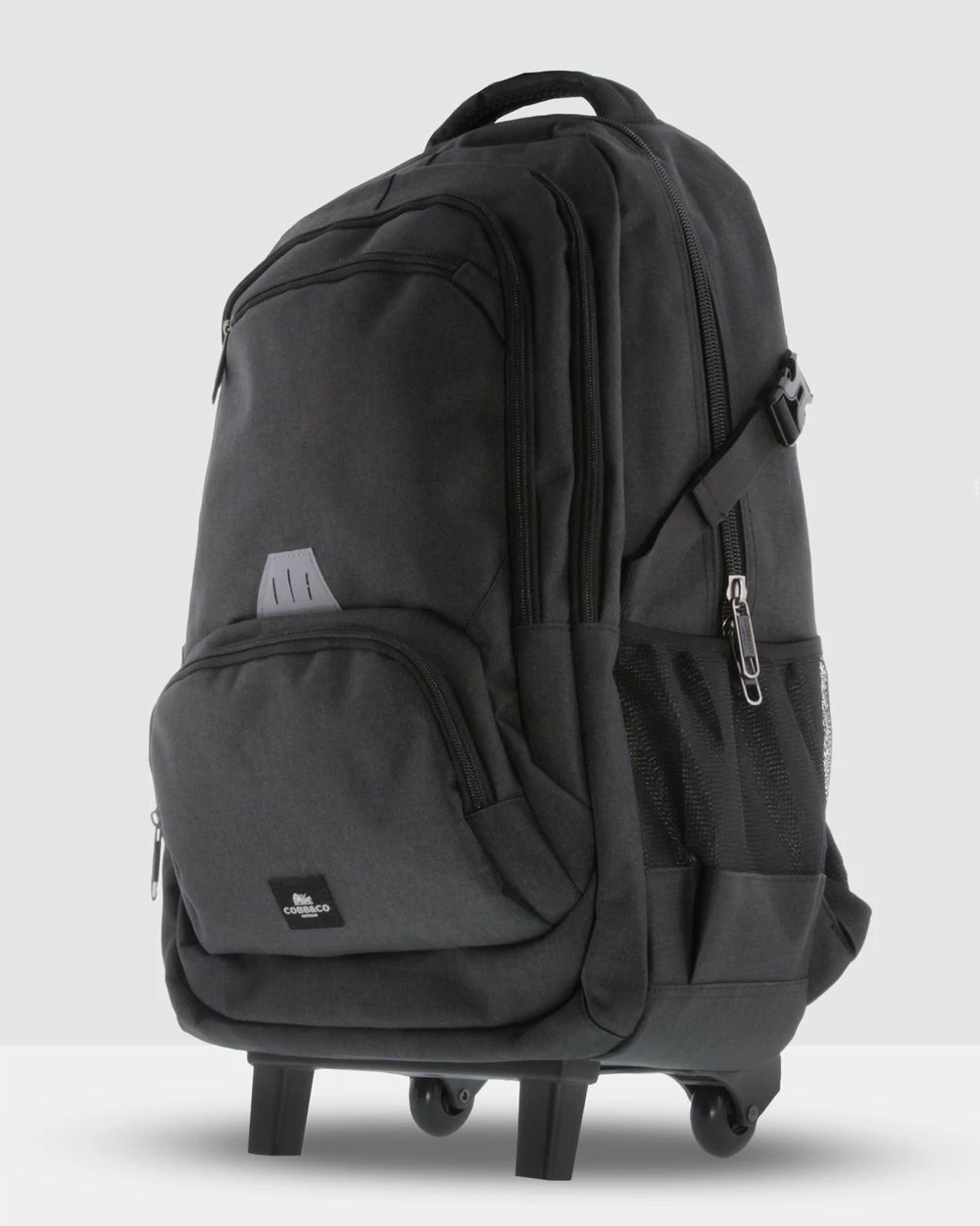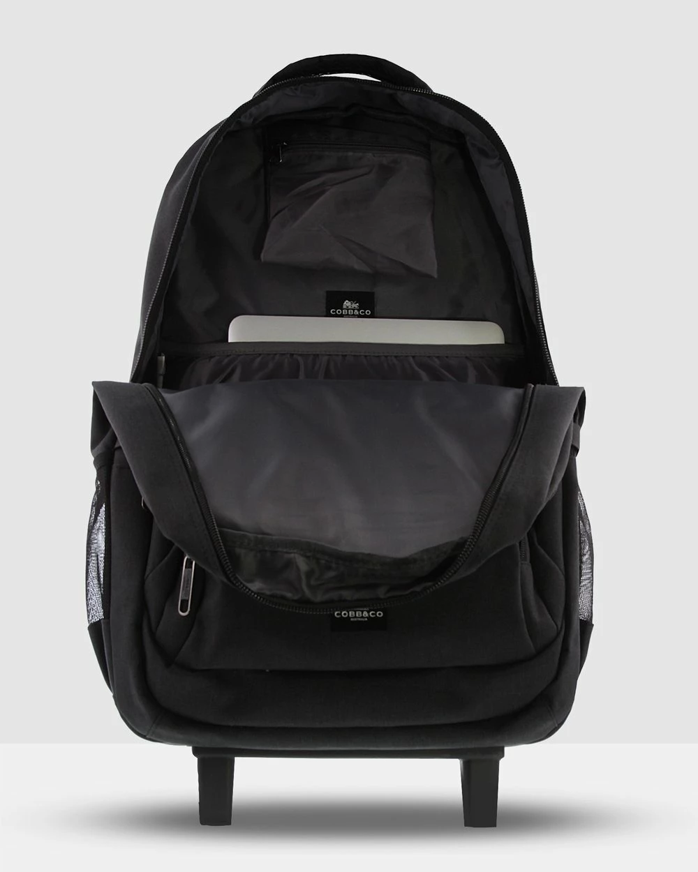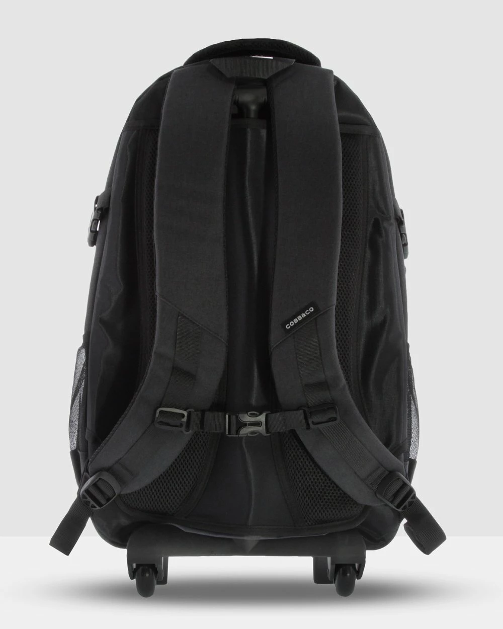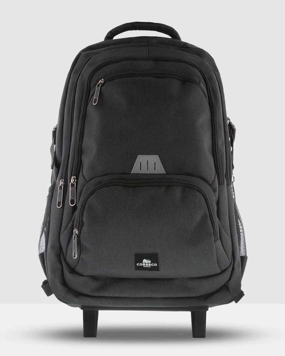 Kane Anti-Theft Trolley Backpack Cobb and Co it is the ultimate storage and travel companion. Features multiple zip compartments and a padded laptop compartment. With back wheels this backpack makes it easy to carry and roll around. Kane is constructed from water repellent fabric with an advanced storage design, padded back, adjustable straps and fully lined interior.