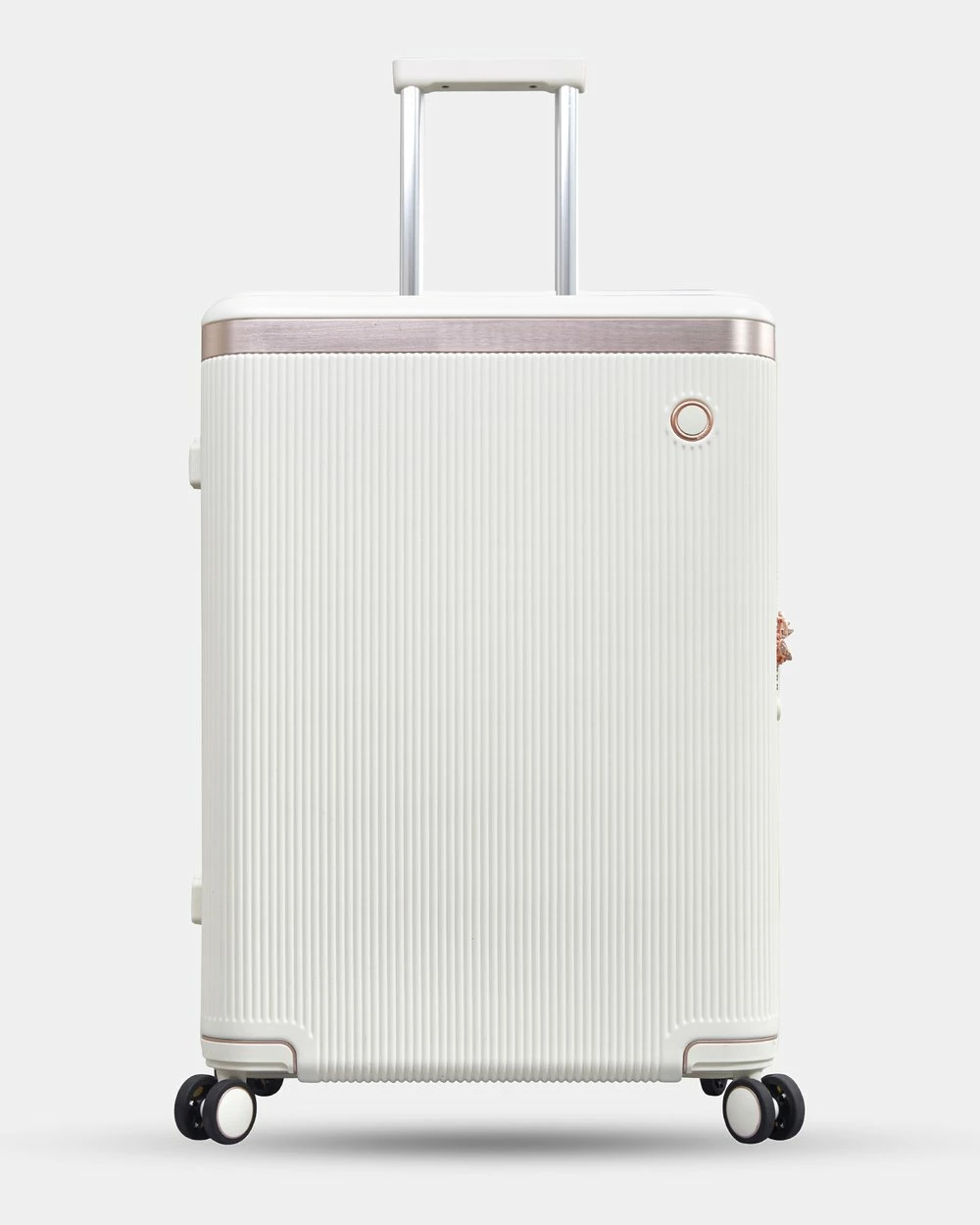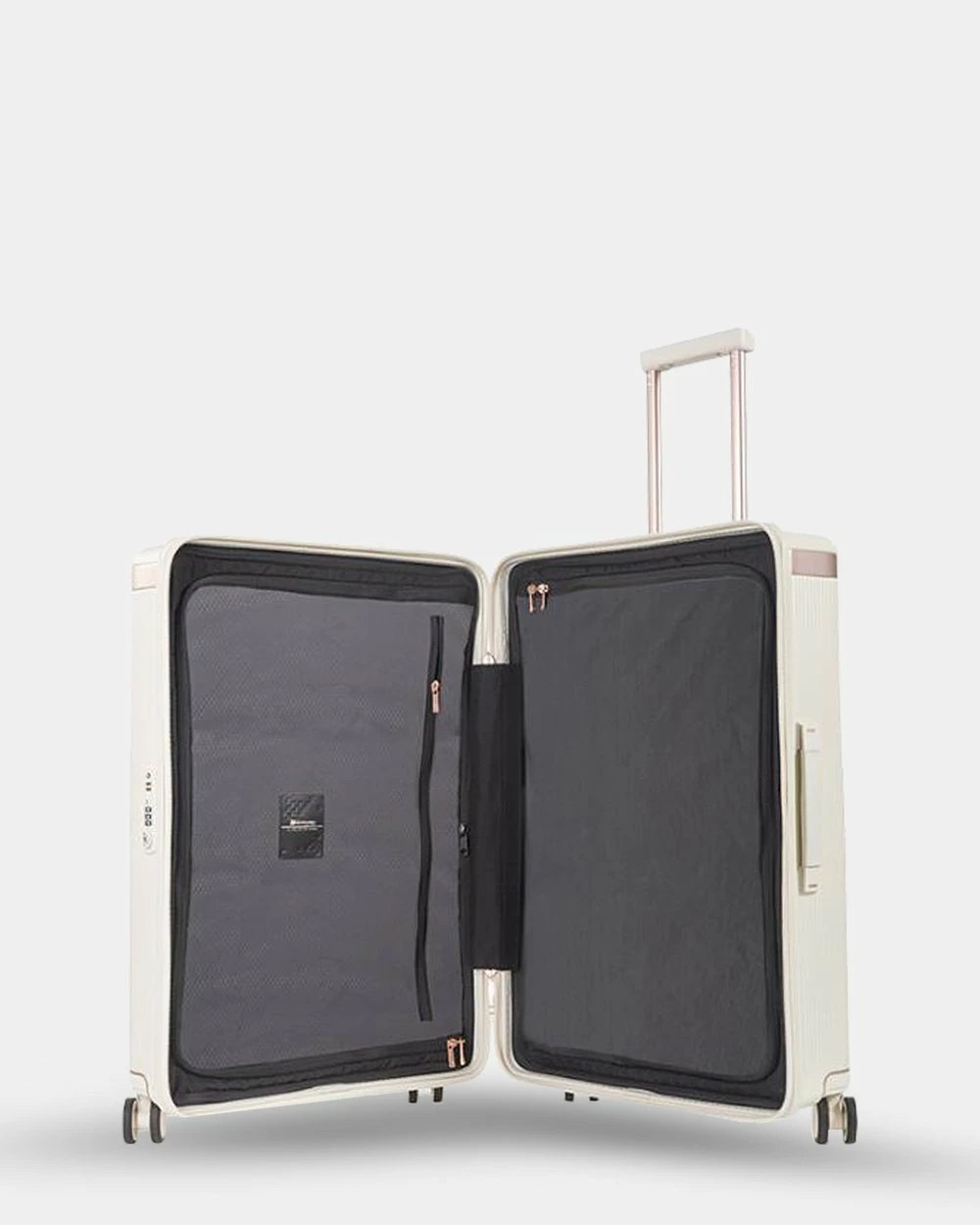 Chicago Large Case from renowned Japanese luggage brand Echolac is constructed with deepened and widened vertical ridges to protect the suitcase body, and create a contemporary aesthetic. Chicago incorporates scratch, shock and impact materials with ultra lightweight technology for longwearing resilience. Alongside the ridged surface, Chicago features elegant aluminum-magnesium alloy reinforcing trim, and interior organised packing solutions such as a divider pad, mesh pocket and cross elastic ribbons. Advanced luggage revolutions coupled with exquisite appearance, Chicago is made for the luxe traveller.