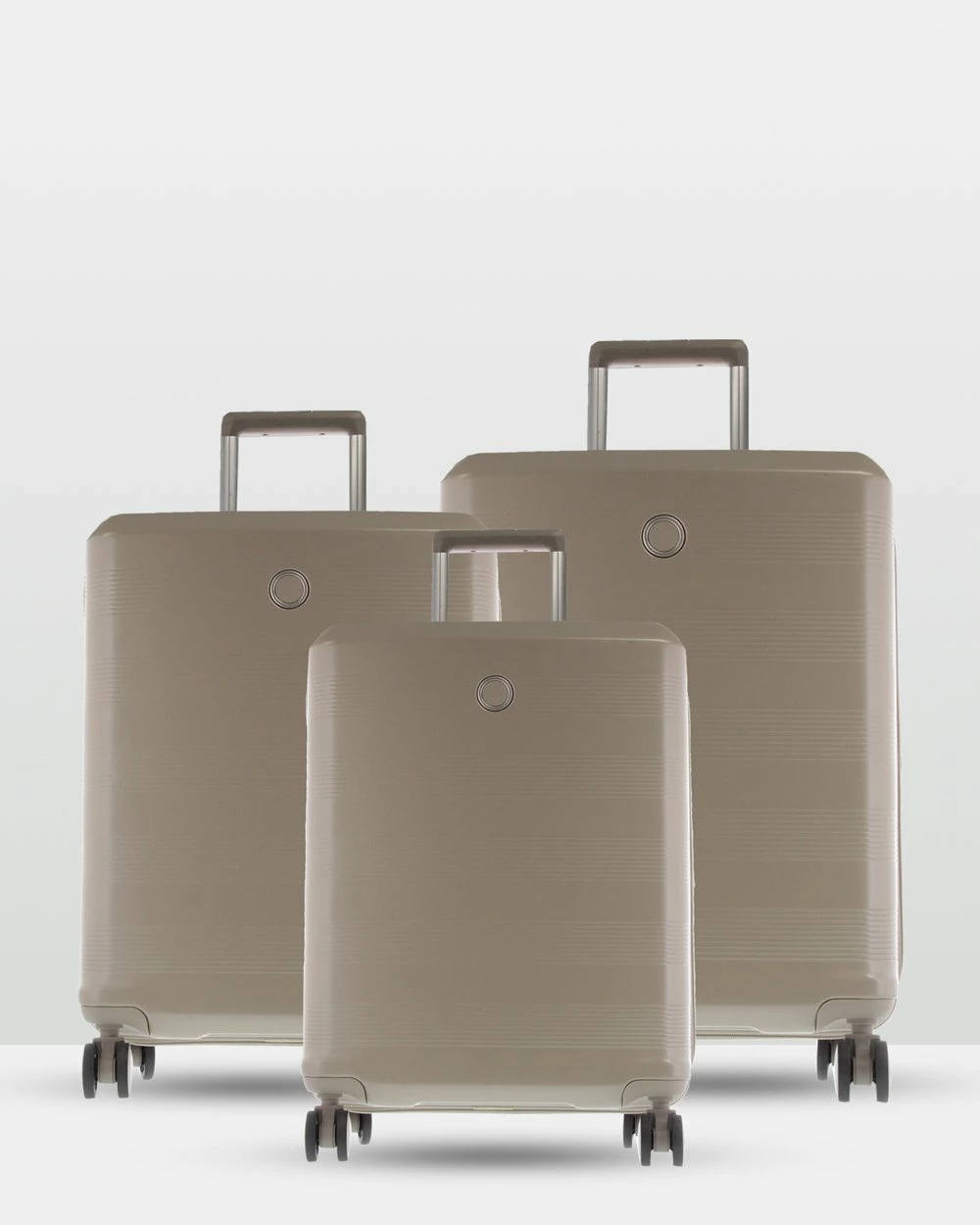 Denver Echolac 3 Piece Set by Echolac Japan has been constructed from polycarbonate material for ultimate strength and shock absorption. With a sleek ridged design and ultra lightweight technology, this luggage is both resilient and refined. Denver features Hinamoto Japanese design wheels for easy manoeuvrability, an expandable double zipper section for increased storage, and a fully lined interior complete with compression cross ribbons and multiple compartments.