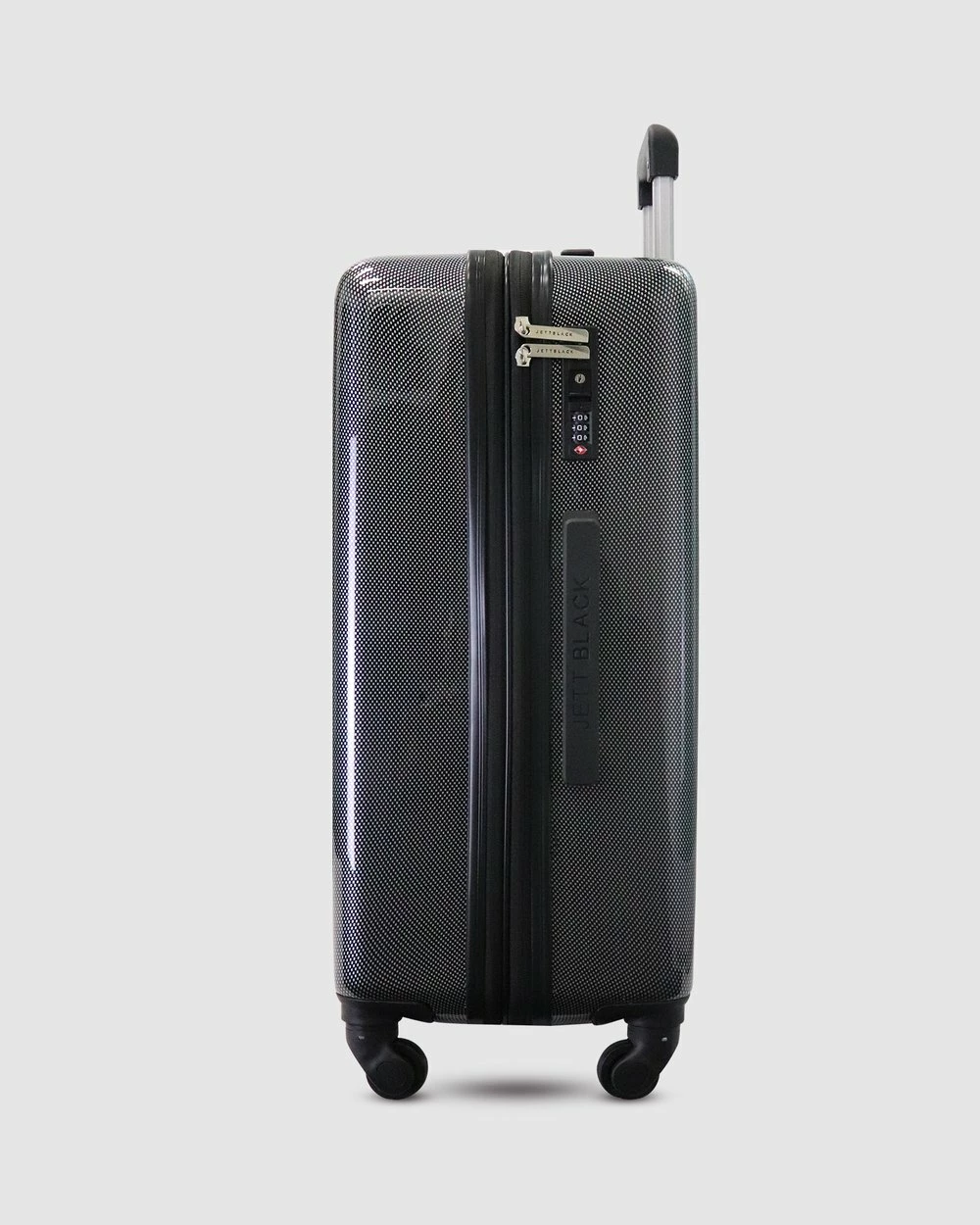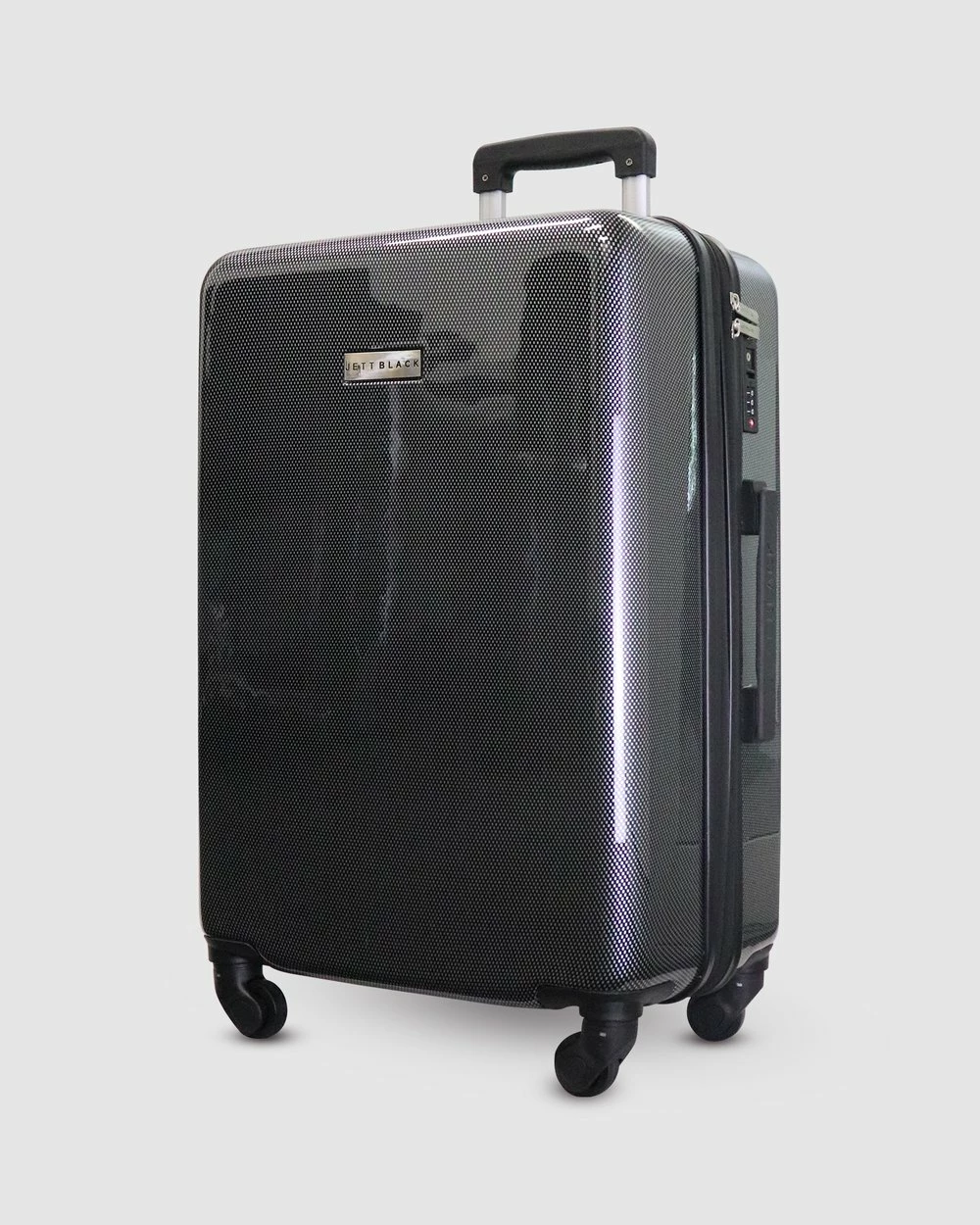 The sleek Carbon Black Series Carry On Suitcase by Jett Black was designed with the fashion forward jet-setter in mind. Featuring the striking metallic carbon fibre design hard case, spinner wheels and an embedded TSA lock for up to date airport security. The striking red colour makes it unique and easy to spot at the baggage claim.