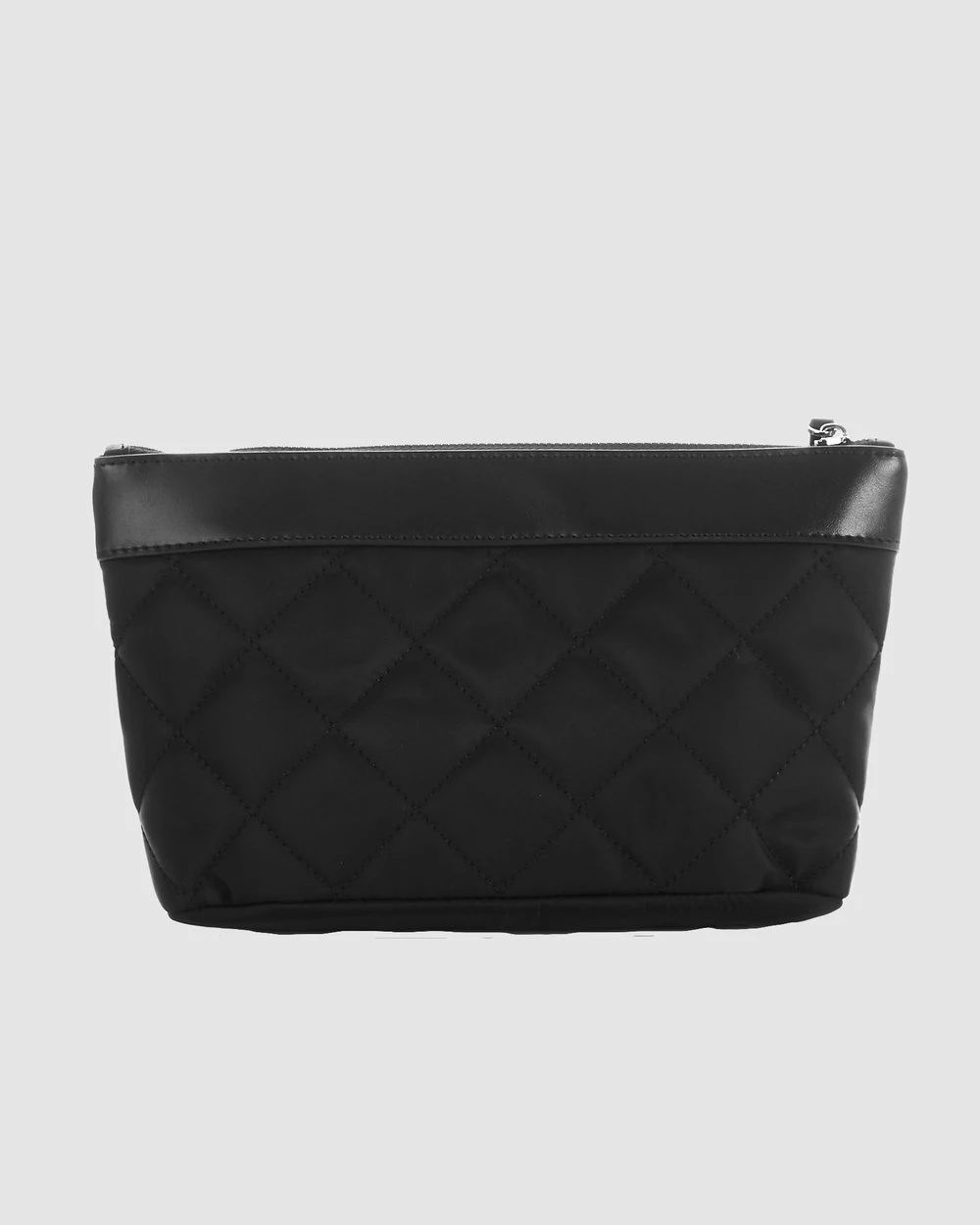 – Dimensions: L 23cm x H 15cm x D 9cm- Quilted Black Nylon- Genuine Smooth Black Leather Accents- Black Leather Zipper Pull- Silver Embossed Logo- Top Zip Closure- Internal Zip Compartment for small items- Soft fabric lining