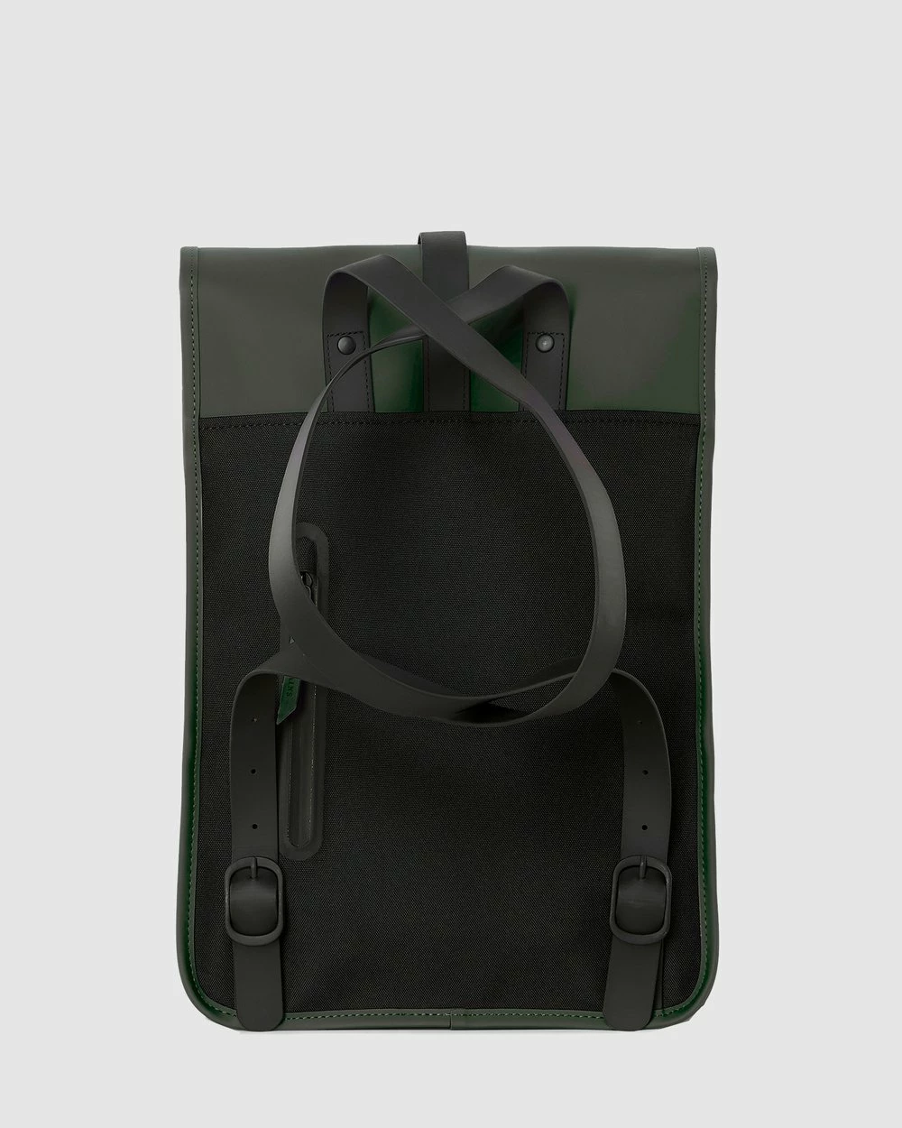 – Measurements: H43cm x W29cm x D10.5cm- Waterproof shell- Matte green colour- Flap closure; clasp fastening- Single main compartment; internal laptop sleeve- Small, vertical zip pocket on the back- Adjustable shoulder straps