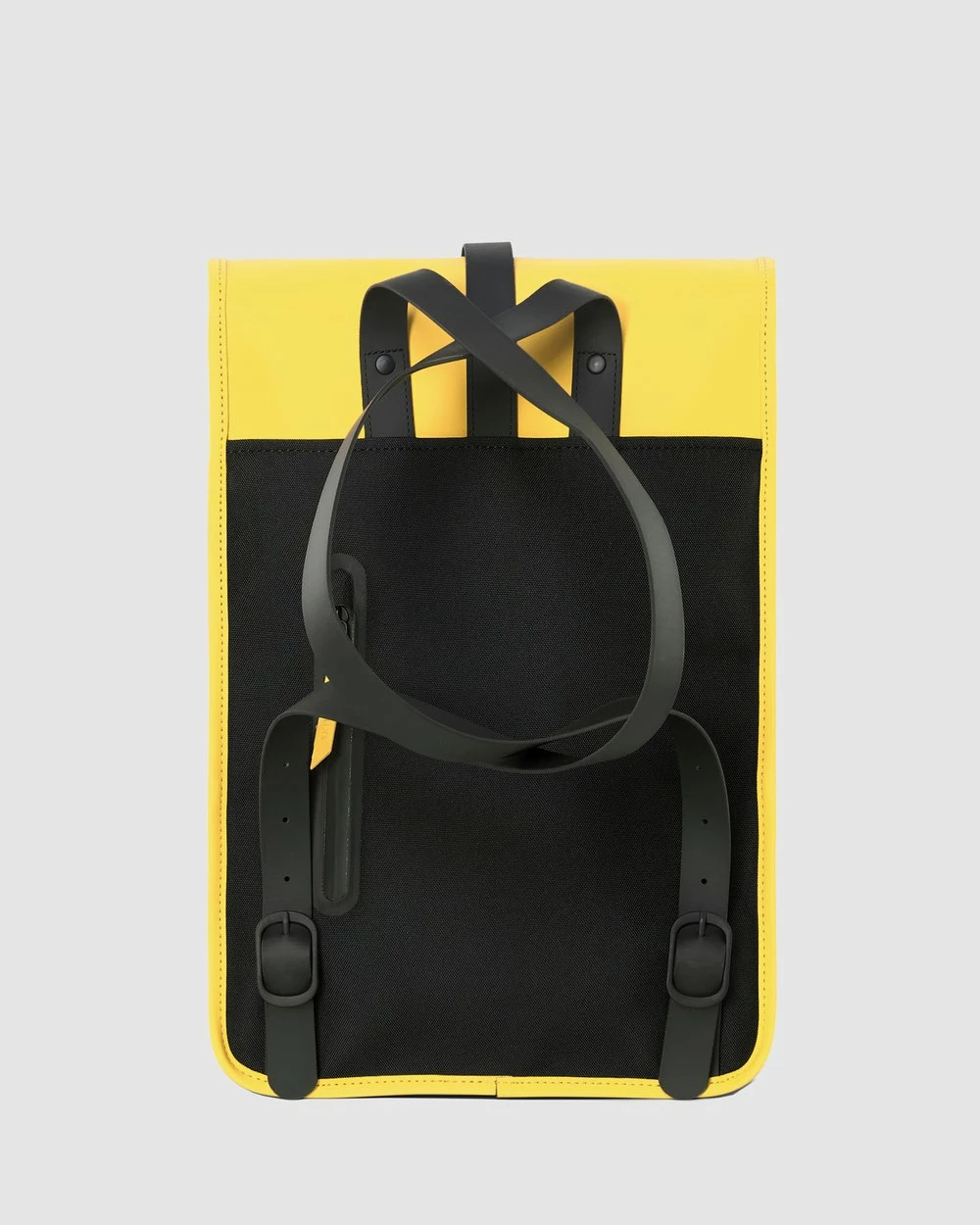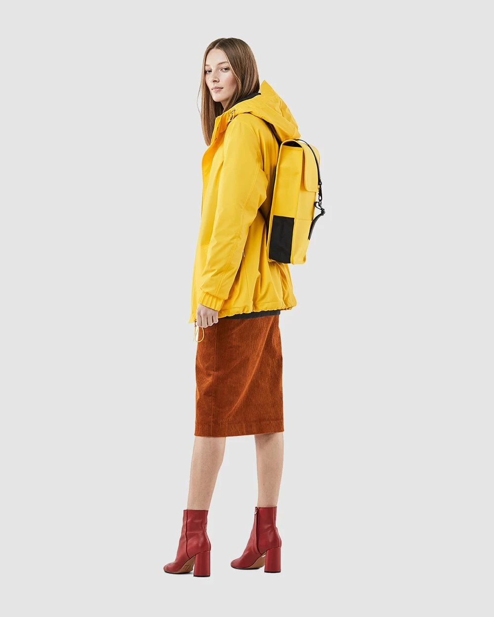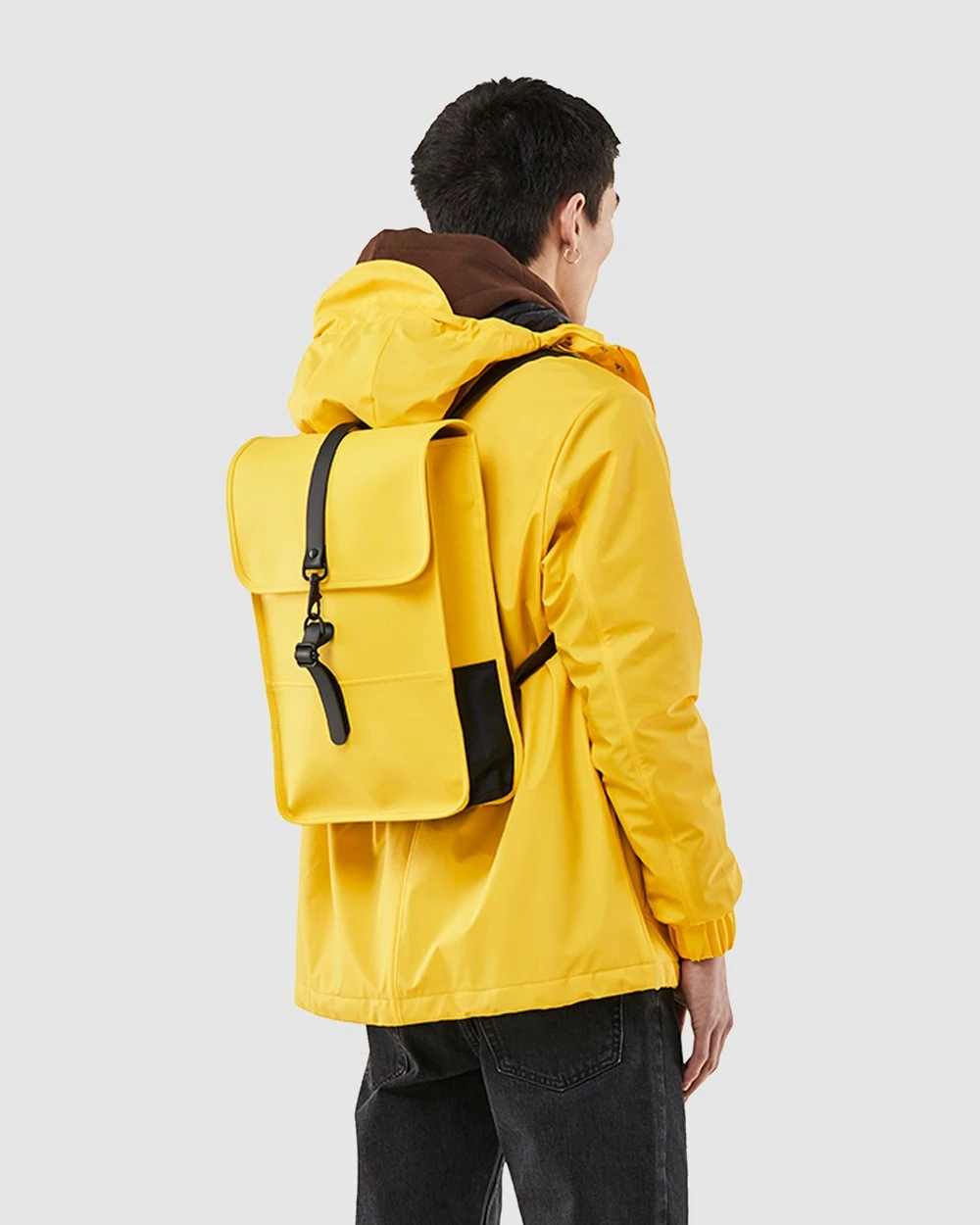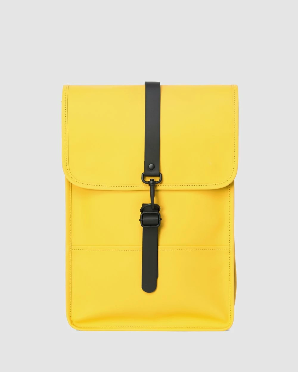 – Measurements: H43cm x W29cm x D10.5cm- Waterproof shell- Bright yellow, matte finish- Flap closure; clasp fastening- Single main compartment; internal laptop sleeve- Small, vertical zip pocket on the back- Adjustable shoulder straps