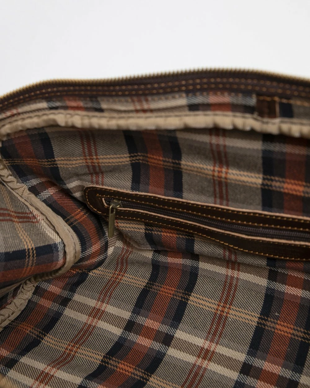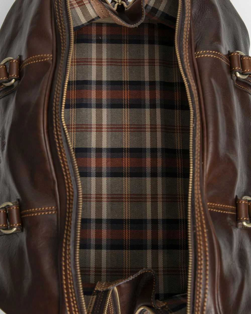 – Full-Grain Vegetable Tanned Italian leather shell; woven plaid lining