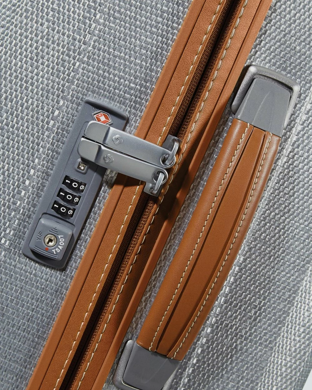 – Scratch-resistant Curv® hard-case shell with leather accents; fully lined