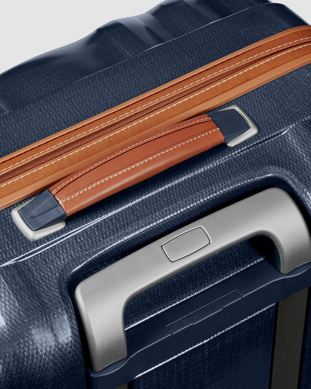 – Scratch-resistant Curv® hard-case shell with leather accents; fully lined