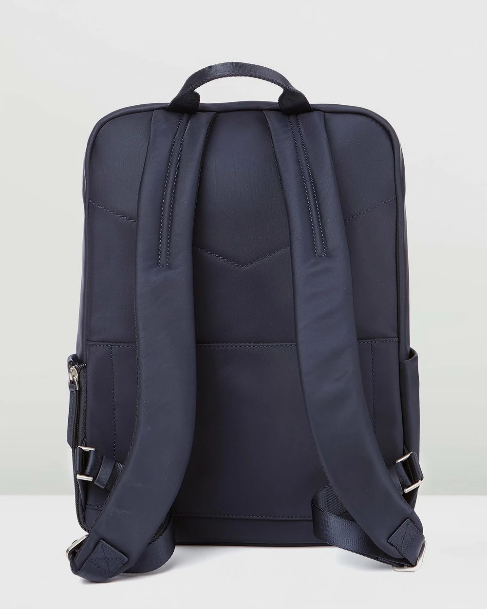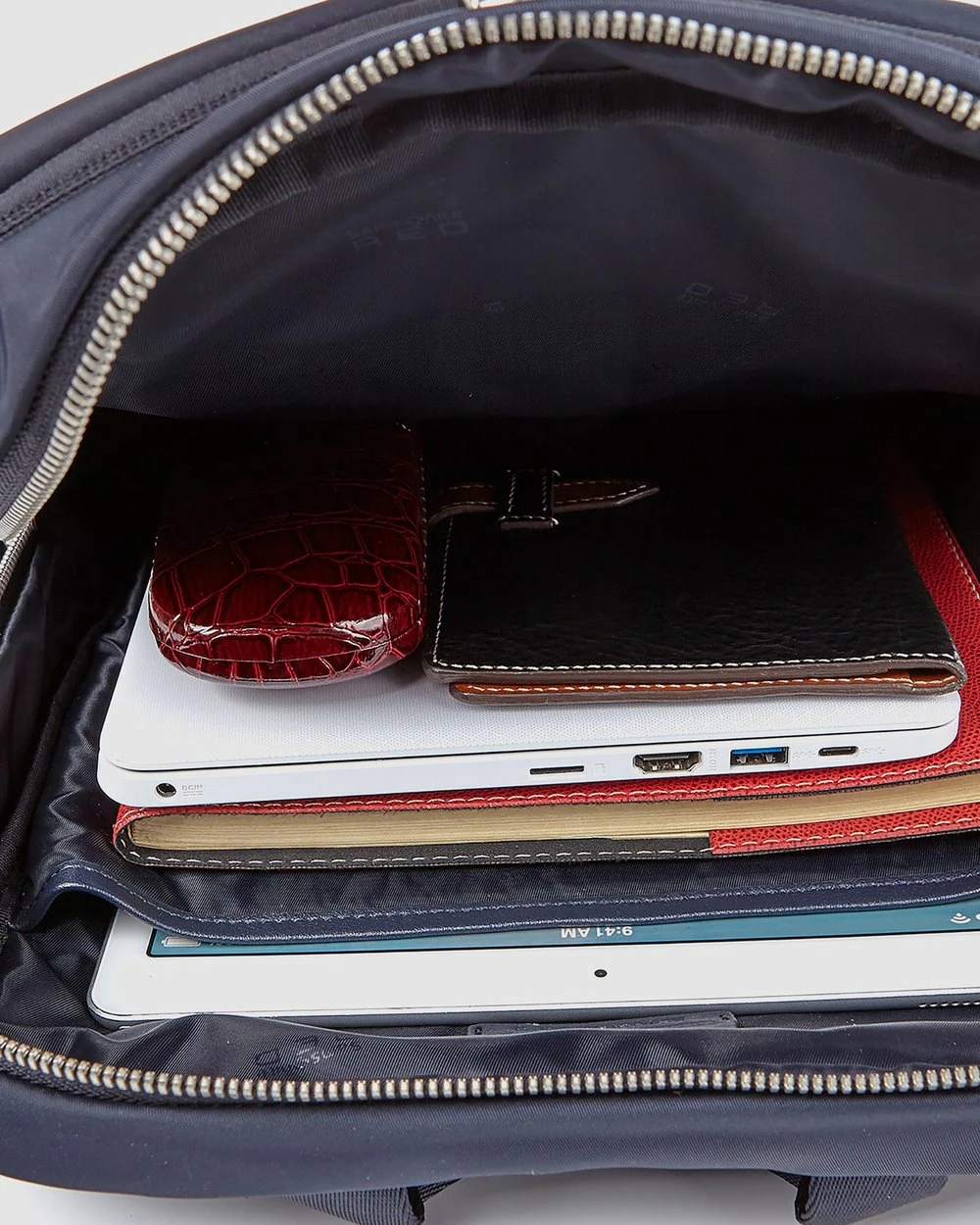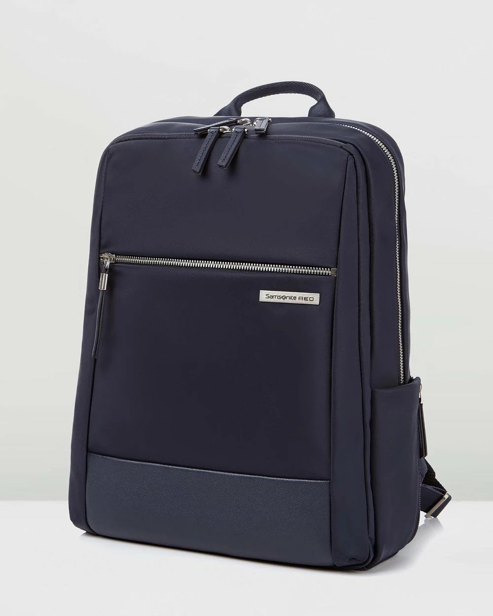 – Measurements: H38cm x W28.5cm x D10.5cm- Smooth faux leather- Navy hue- Dual zip-around main compartment- Additional zip pocket opens at top- Front zip pocket- Pockets to sides- Soft grab handle to top- Branded tab to front; silver-toned hardware- Adjustable shoulder straps- Internal pocket