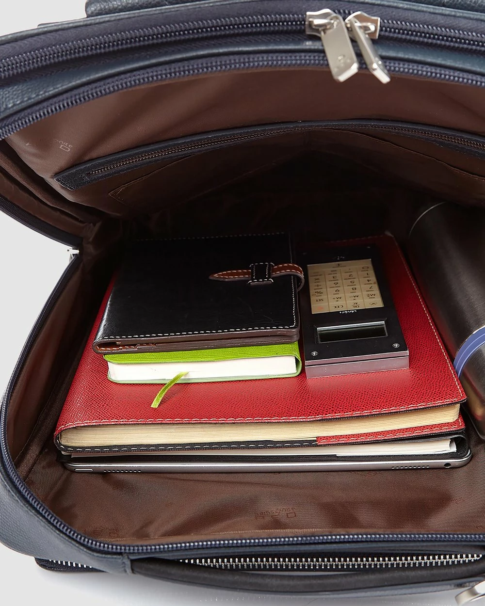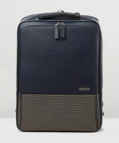 – Measurements: H44cm x W32.5cm x D12cm- Pebbled faux leather construction- Navy hue; brown panel; brown lining- Two zip-fastened main compartments- Top carry handle- Front pocket; zip closure- Adjustable shoulder straps- Internal pockets