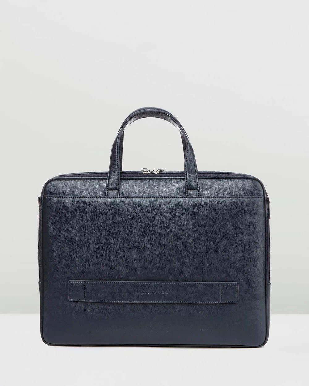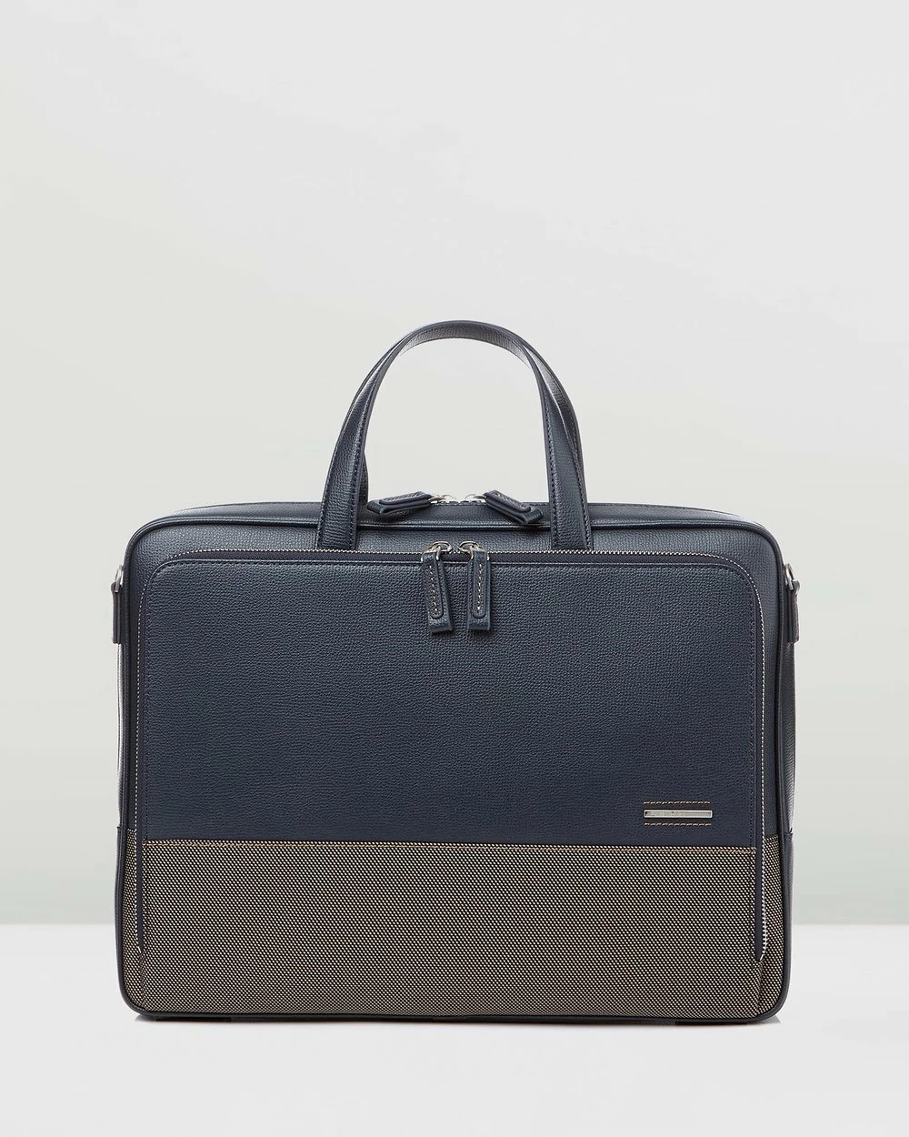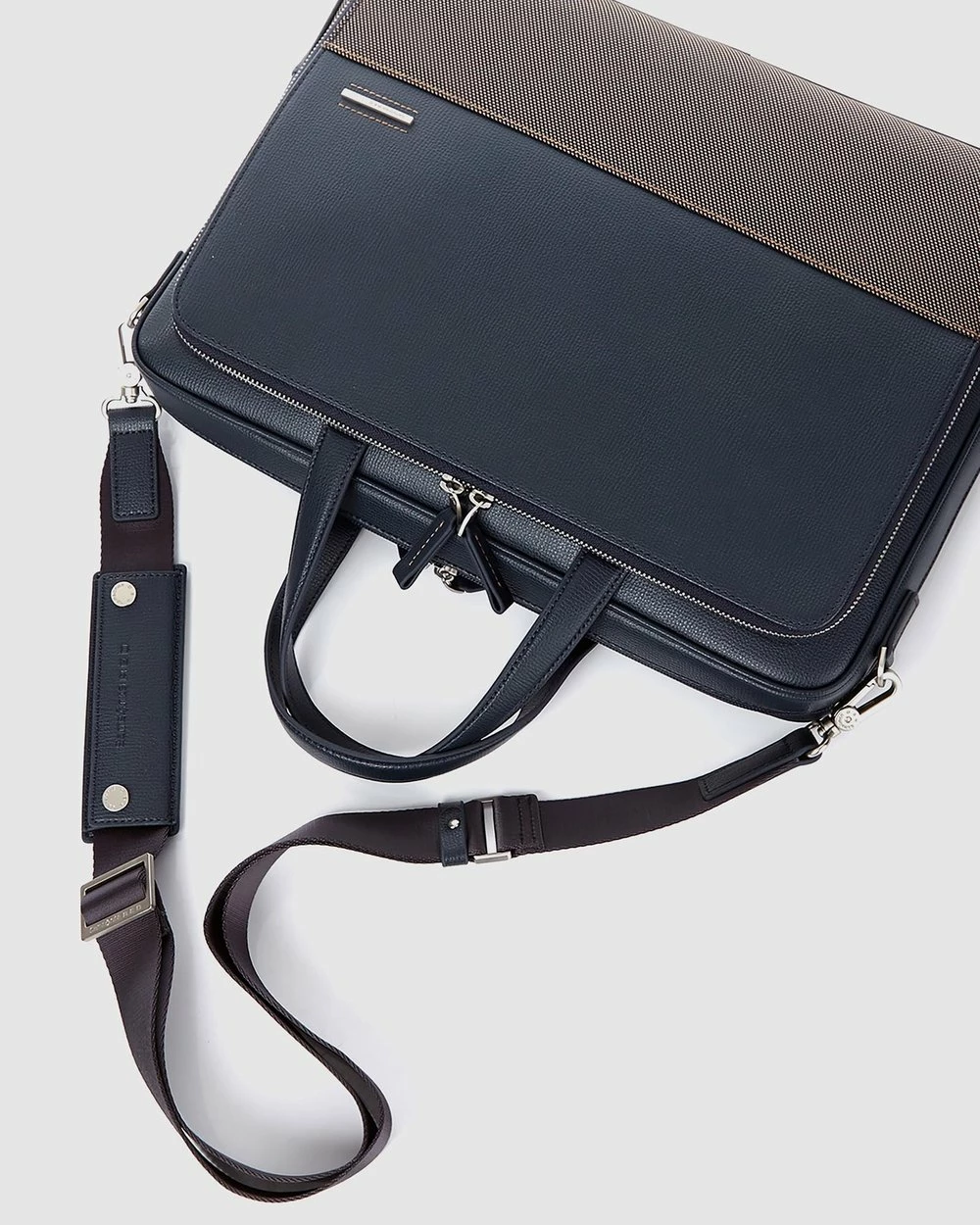 – Measurements: H31cm x W41cm x D7cm- Pebbled faux leather construction- Navy hue; brown panel; brown lining- Zip-fastened main compartment- Top carry handles- Front pocket; zip closure- Back pocket- Adjustable shoulder strap; removable- Internal pockets