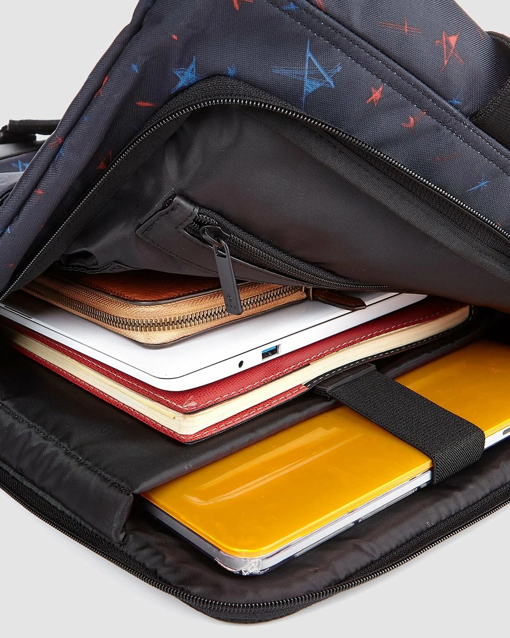 – Rear zip pocket; inner zip pocket and Velcro-fastened tech sleeve