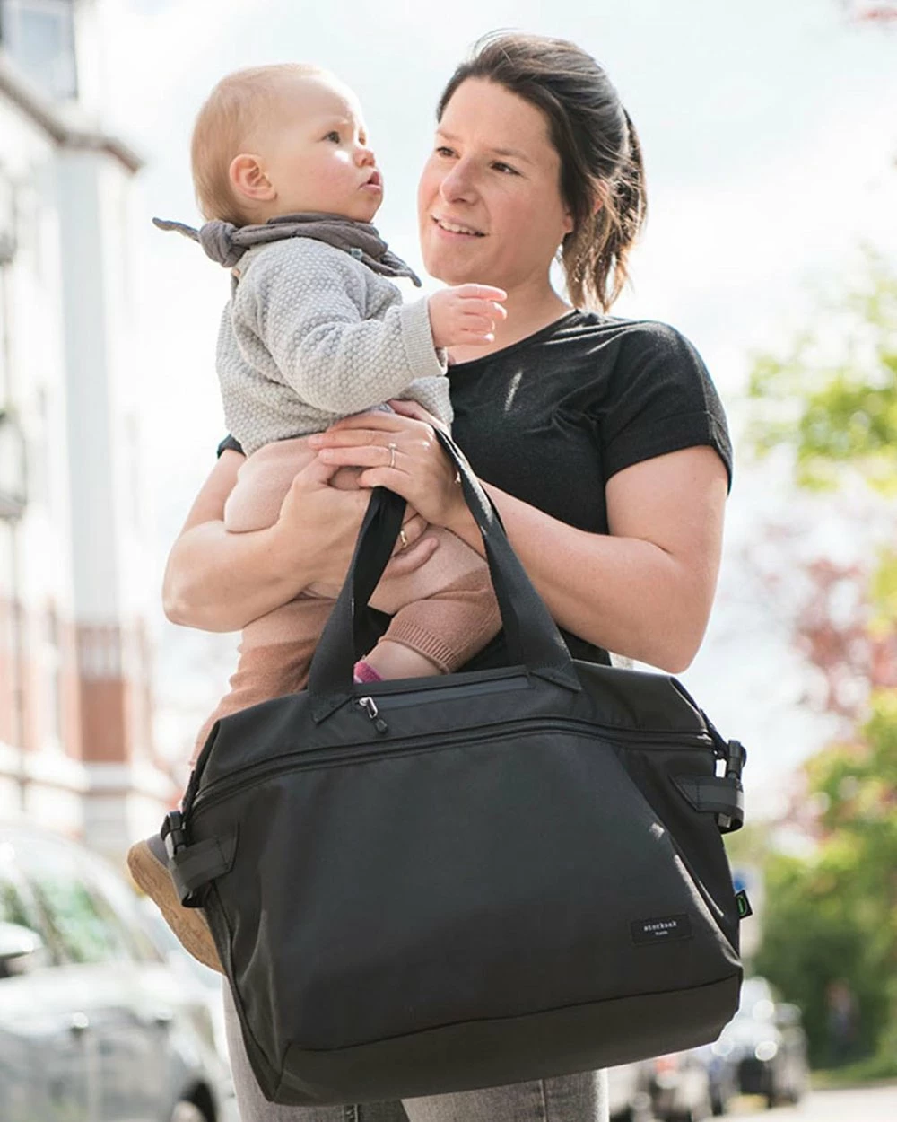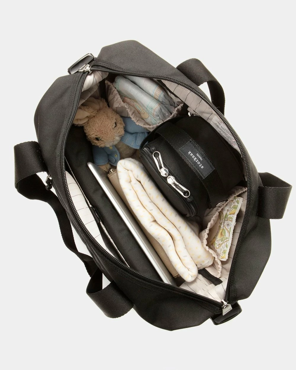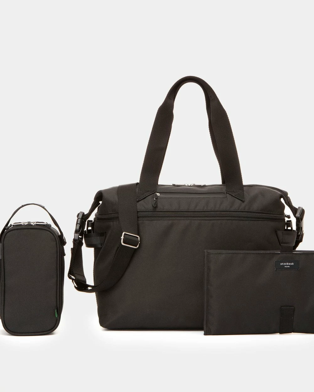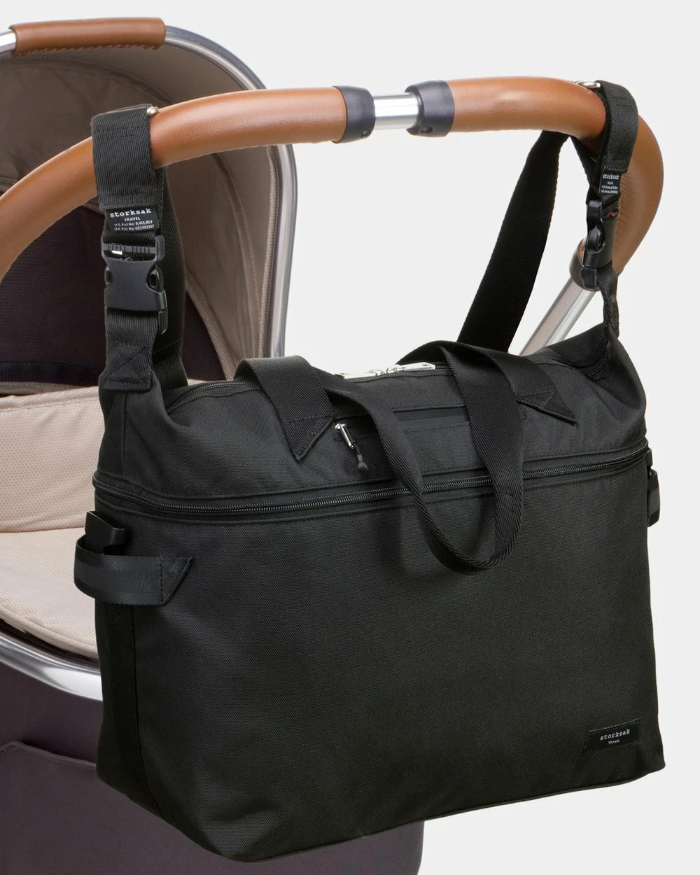 The Travel Expandable Tote nappy bag by Storksak features as expandable section allowing you to easily increase the size of the bag for extra storage.