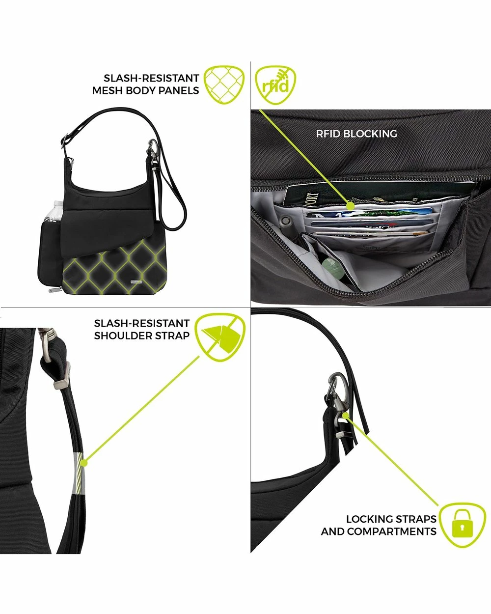 – Slash-proof shoulder strap and body panels